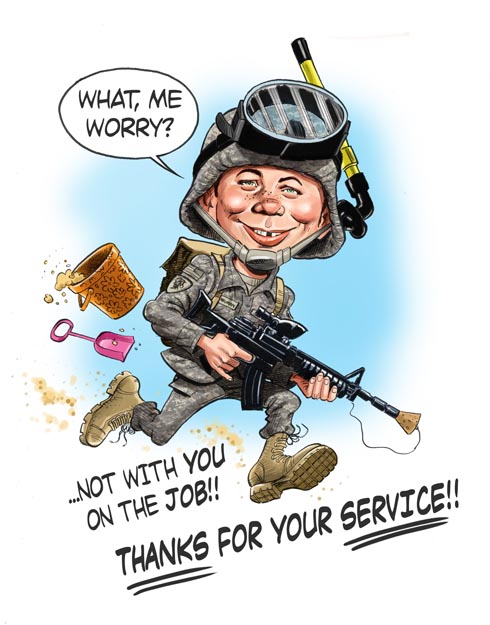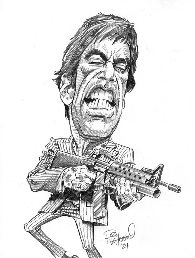 It’s another “famous movie moment” caricature sketch! This week features Al Pacino going full-on cocaine rage in “Scarface” in the “Say hello to my little friend!” scene. This is another good example of how, in the moment and with the expression/emotion being shown by the subject, a lot of the usual likeness landmarks of the subject have to be ignored. Typically when you think of Al Pacino, you think of heavy, sleepy eyelids, a long nose, a small mouth and very high and sharp cheekbones. This moment requires emphasis on the mouth and the gritted teeth, the squinted eyes, and angled back head. All that… READ MORE