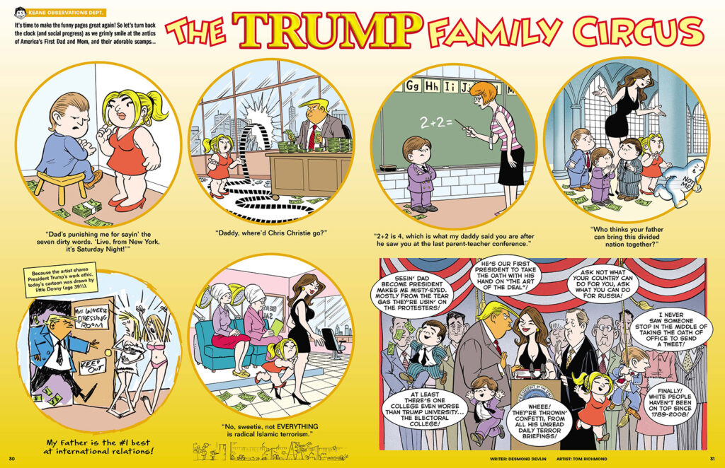 It’s another nauseating Monday MADness as we chronologically look back at my work for MAD Magazine! We are nearing the end of the New York MAD era with this peek at a piece I did for MAD #544 (April 2017) called “The Trump Family Circus”, written by my CLAPTRAP cohort Desmond Devlin! Mimicking Bil (and later Jeff) Keane‘s art style was nothing new for me. Just a few years earlier I did a similar job for MAD #520 called “Honey Boo Boo’s Family Circus”, but that one was written by Frank Santopadre. Most of the interesting things about a job like this I wrtoe about… READ MORE