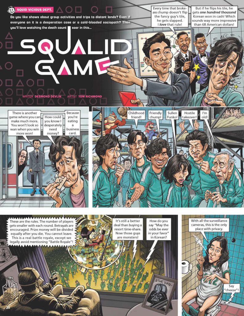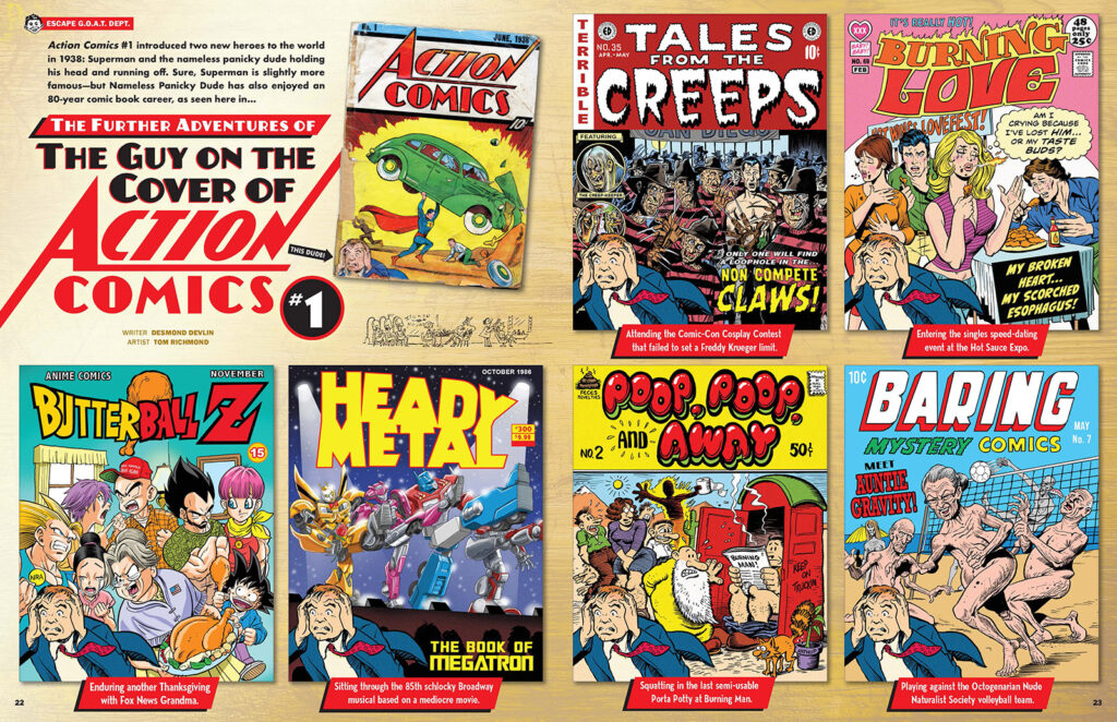 Here we go with another useless look back at my work for MAD Magazine, and we are very rapidly catching up to present day. This piece appeared in MAD #44 Aug 2025, which was on newsstands in June. That was only 6 months ago! This was written by my CLAPTRAP cohort Desmond Devlin. This issue was “Superman” themed, as it dropped right around the time the James Gunn “Superman” movie came out. It was yet another issue that featured multiple pages of new content (14 to be exact) all of which was Superman-centric. Des came up with this clever two pager where the guy who… READ MORE