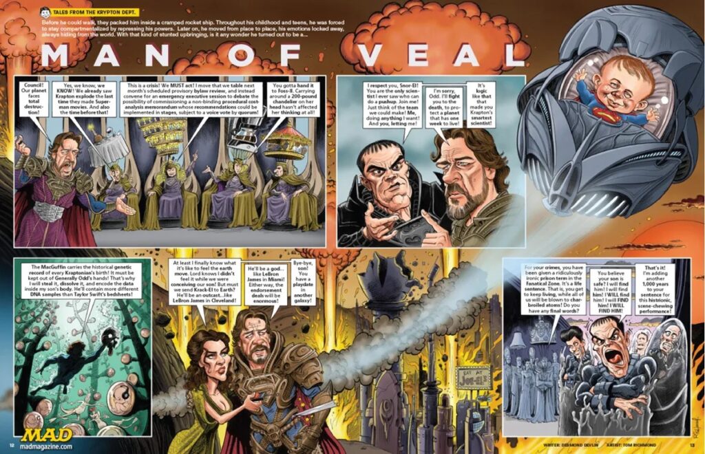 Look, Up in the sky! It’s a bird! It’s a plane! It’s… MONDAY! That means it’s time to upend truth, justice, and the American Way with another look at the alien life form that was my work for MAD Magazine! This week we have a look back at MAD‘s parody of the movie “Man of Steel”, written by my claptrap co-hort Desmond Devlin and first appearing in MAD #524, December 2013. I don’t have much in the way of backstory for this job. It was just the usual rigamarole. I do remember having a lot of fun drawing Michael Shannon as General Zod. There is… READ MORE
