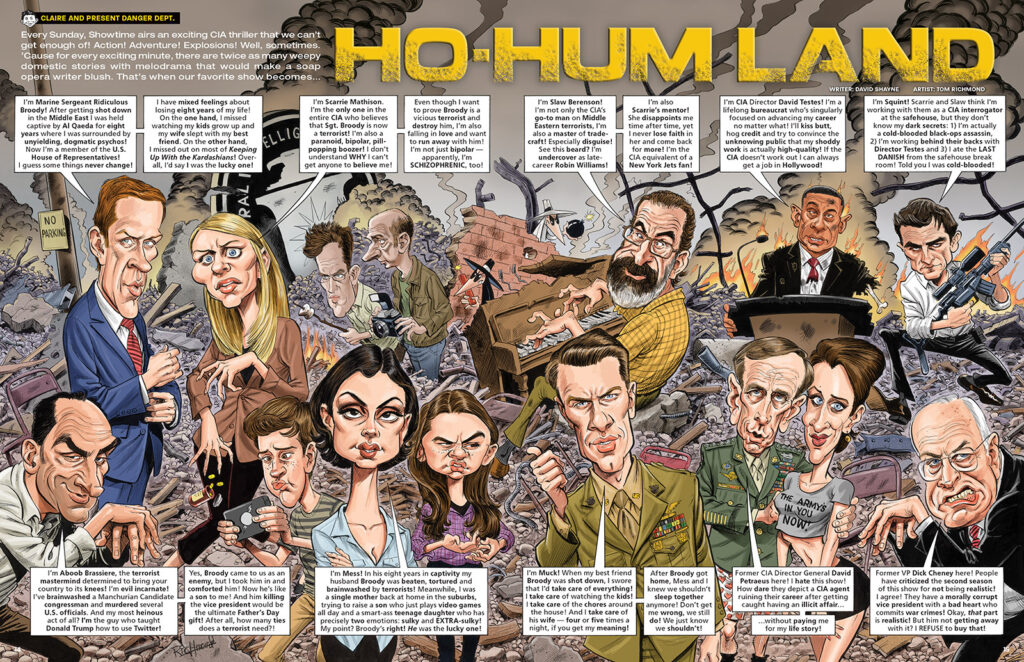 It’s Monday again… or IS it? You never really know what’s real and what’s not in the shadowy world of espionage, but regardless we are going to spy out this TV parody of the Showtime series “Homeland” from MAD #523, October 2013, written by MAD editor David Shayne. One thing I remember about doing this one was that that the MAD folks wanted me to put the spies from Spy vs. Spy in as many background cameos and gags as I could. I didn’t include them in the splash page in my initial rough so I added them in the final. They show up a… READ MORE