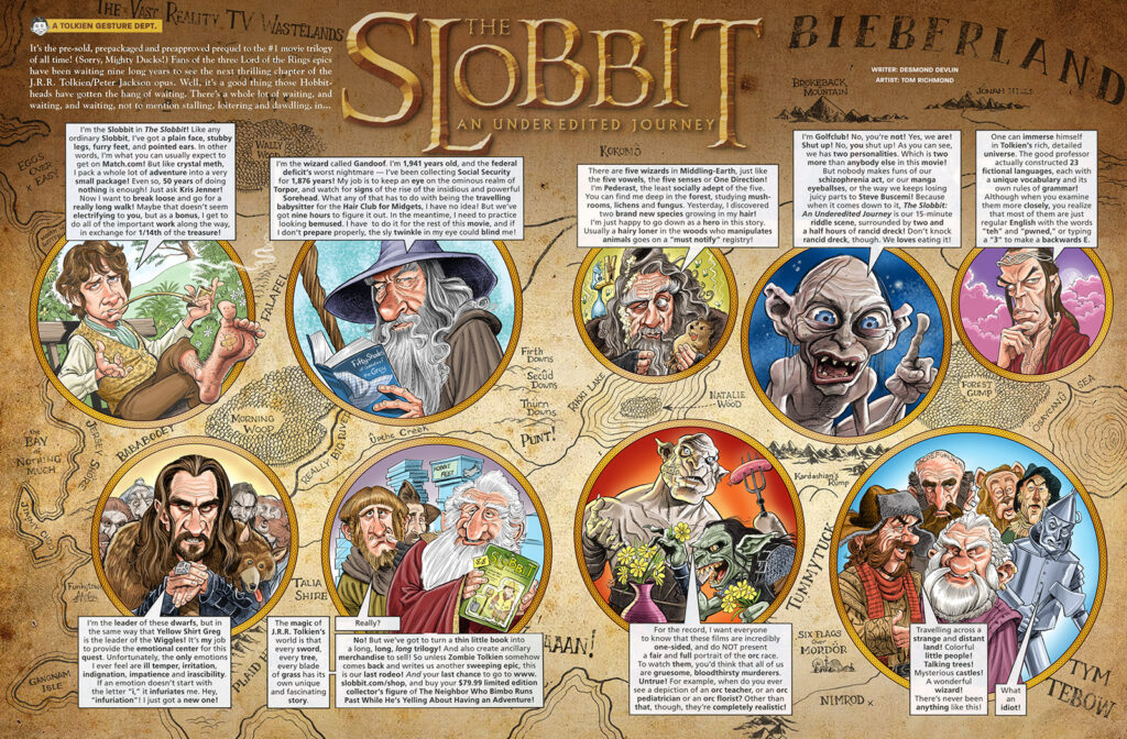 Goblins, Wargs, and Dwarves… oh my! It’s a Middle-Earth Monday as we continue our journey along the paths through the Mirkwood that was my work for MAD Magazine. That trip seems short compared to the long, drawn out, padded three movie trek to the Lonely Mountain that only took one book to accomplish! This was the parody for the first of “The Hobbit” trilogy movies “The Hobbit: An Unexpected Journey”, written by my CLAPTRAP cohort Desmond Devlin and first appeared in MAD #522, September 2013. Due to the odd nature of the splash with the map and overlaying insets I didn’t do the inked text… READ MORE