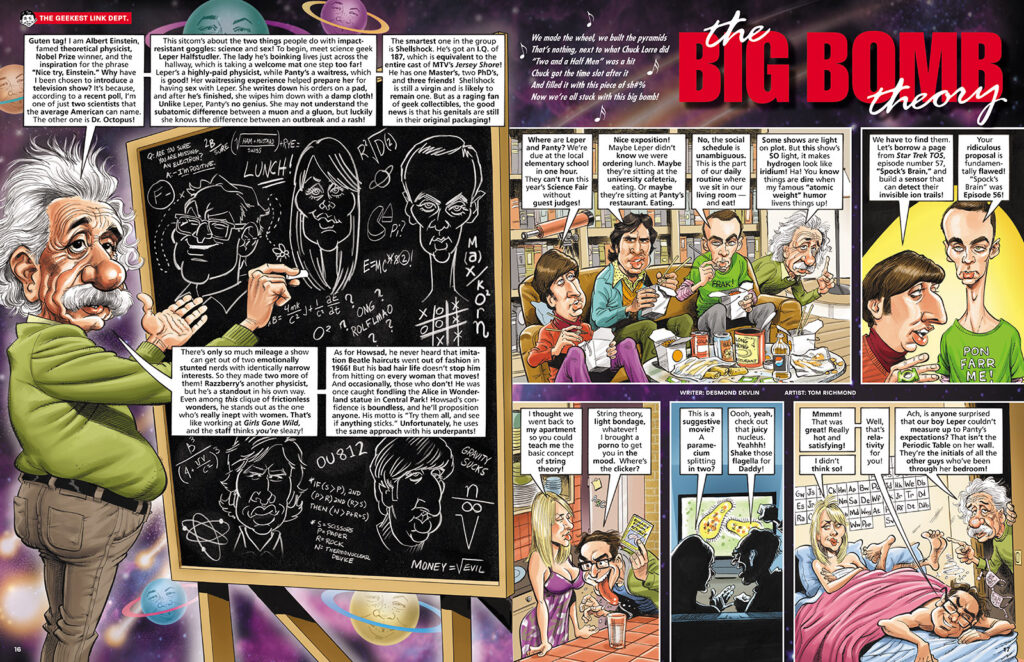 Don’t go getting your quarks all in a bunch… I know it’s Monday and that means it’s time to get our hadrons on and examine more of the decaying matter that was my work for MAD Magazine. This week we pick up where we left off last Monday, and look at the other piece I had in MAD #503, May 2010. That was a very short parody of the TV sitcom “The Big Bang Theory”, written by my CLAPTRAP cohort Desmond Devlin. The part about this job I remember most was trying to figure out the best way to handle the “chalkboard” caricatures that were… READ MORE