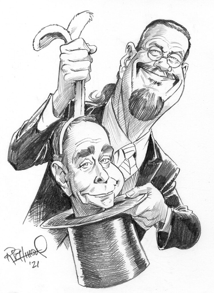 This week’s SotW is of the magical comedy duo Penn & Teller! The original sketch of this is available in my Studio Store! I’ve actually met Teller. He is a friend of fellow caricaturist and the editor of my “The Mad Art of Caricature” book Celestia Ward. I was at her wedding years ago in Las Vegas and Teller was also in attendance. I chatted with him briefly and yes, he does talk. A subscriber of my “Ink Stained Wretch” newsletter wrote me after I shared this in a recent edition to tell me he saw Penn & Teller in one of their first appearances… READ MORE