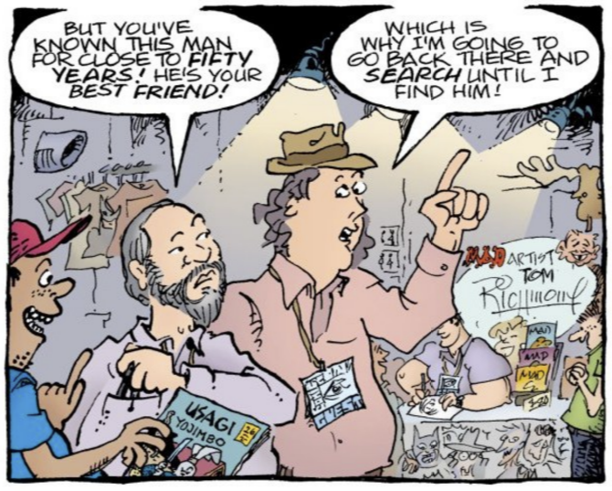 Q: As you’ve been revisiting your old work, have you had any OH SH*T moments when you saw something you’d overlooked. I don’t mean things that you look back on and see how you might have done them better, but genuine oversights like “I forgot to give that guy feet”? A: I have been trying to think of any really “OMG I can’t believe that got by me” sort of things but nothing really egregious comes to mind. I notice a LOT of times where I missed coloring something, so someone’s hand is the green of what’s behind it or whatever, but I’ve can’t recall ever giving… READ MORE