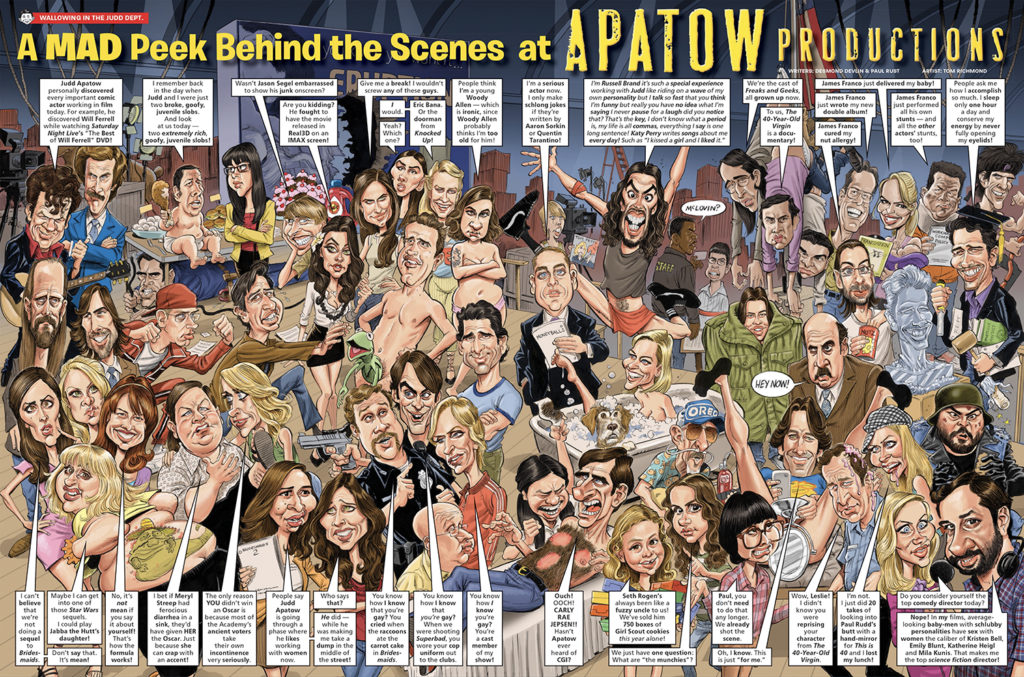 This is a two page spread I did for the book Inside MAD back in 2013. It was just for the book and never appeared in the magazine. Inside MAD is a large book full of rarely seen reprints of MAD features as chosen by the Usual Gang of Idiots, as well as essays by a number of famous entertainers about how MAD influenced their careers. The introduction of the book is written by the comedy film writer, director and producer Judd Apatow. In his intro, he vehemently points out that MAD never has done a spoof of any of his movies or TV shows. Turn the page, and you see this. Written… READ MORE