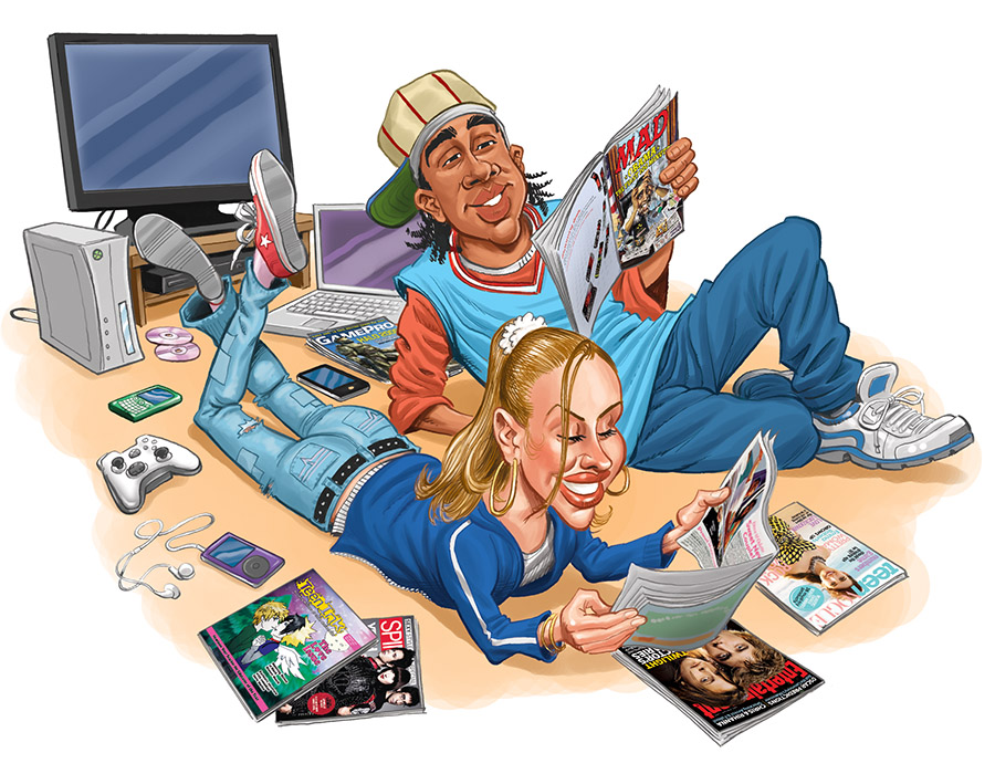 This is a 1/2 page illustration I did for School Library Journal back in 2009 for a story about how magazines were becoming more popular with teenagers at the time. The idea was the kids were ignoring their electronics in favor of physical reading material. Of course I snuck MAD in as one of the magazine. Something tells me the boon in popularity of magazines was short lived. Here is the pencil sketch for that illustration: READ MORE
