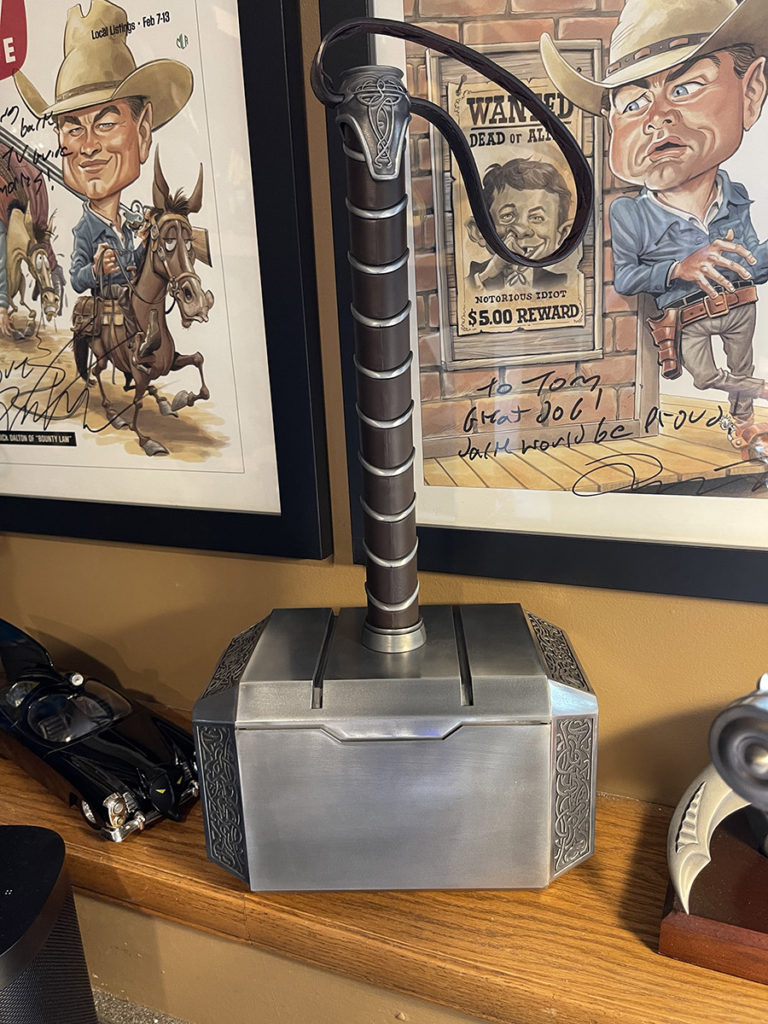 I’m usually all about the Bat-stuff when it comes to the studio but some things are just too %$@#& cool. The Lovely Anna asked me in exasperated fashion a few days before my birthday last month what I wanted as a present, and I said “Mjölnir, the Hammer of Thor!” (said it just like that, in bold italics). This just arrived the other day. It’s a full scale, full metal build, extract prop replica. Weighs about 10 lbs. However I’m thinking about returning it for a refund because I think it’s defective. For starters, I can pick it up quite easily, and I KNOW I… READ MORE