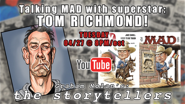 I’ll be doing a live interview tonight at 8:00 pm EDT (7:00 Minnesota time) with comic book artist extraordinaire (and fellow National Cartoonist Society member) Graham Nolan on his YouTube channel “The Storytellers”. We’ll be talking about MAD, caricature, CLAPTRAP, influences, comics, and other stuff. Graham asks great questions and also takes questions from viewers, so drop by and sit back and watch, or jump in with some questions! READ MORE