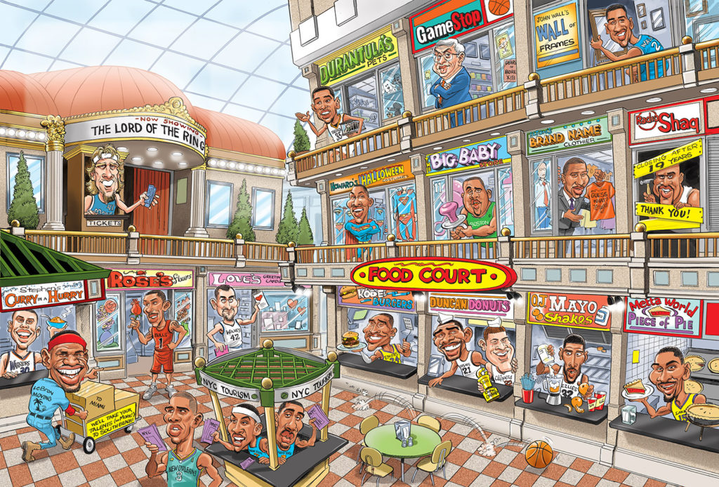 I did this two page spread for Sports Illustrated Kids back in 2011. It was a goofy, fun feature where (then) current NBA players had their own mall with gag stores, etc. I can’t find any tearsheets so I do not know who the writer was. READ MORE