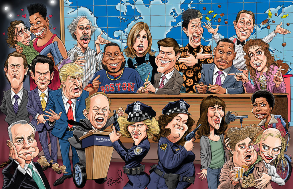 A few days ago the official “Daily Coronacature” subject was SNL alum Leslie Jones, so I posted a caricature of her and Kyle Mooney I had done as part of an illustration of the full 2017 Saturday Night Live cast. A few people asked to see the full piece. Here it is. I did this as a personal commission for another member of the Not Ready for Prime Time Players, Bobby Moynihan. Bobby want it to give to the cast as an end of the season gift, since it was his last on the show. He told me which character each person should be drawn… READ MORE
