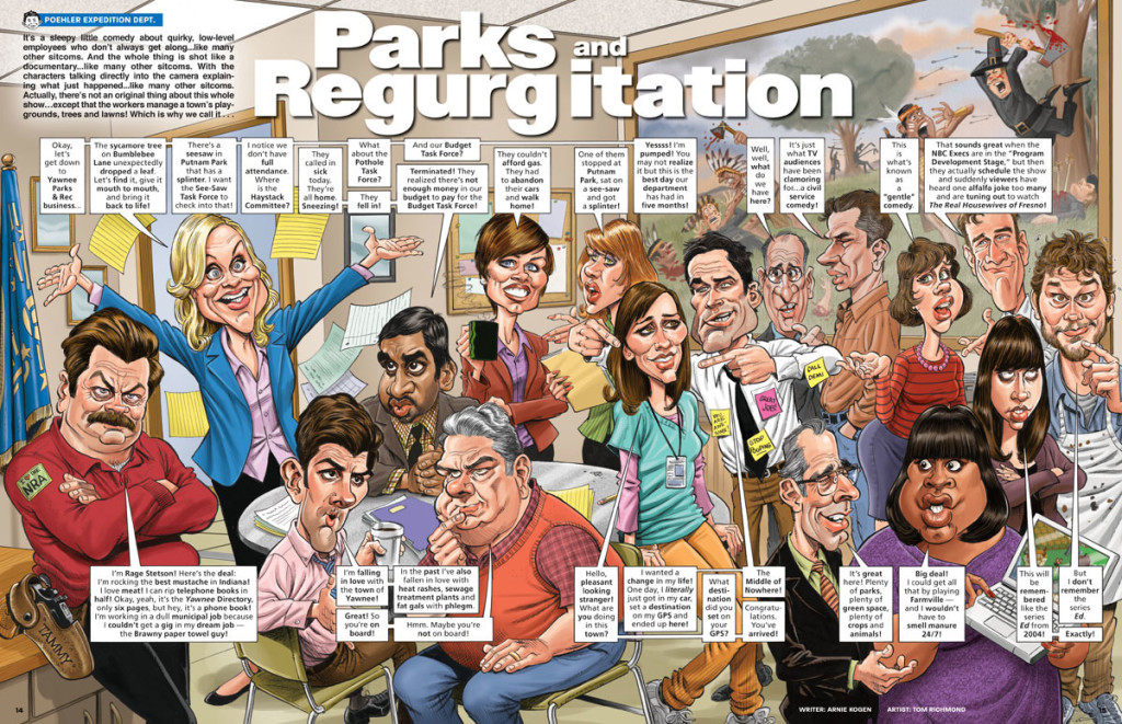 It’s time for another MAD Monday stop on the long, exhausting and utterly pointless trek through my work at MAD Magazine. This week we have a look at another TV parody, “Parks and Recreation” written by the inimitable Arnie Kogen and first appearing in MAD #511, October 2011. This was the last parody in what was, for me, the longest run of consecutive issues of MAD featuring a full movie or TV parody with my art. If you count “The Wizard of O” (and I do) this is eight issues in a row with a “continuity” drawn by me in it. A personal best. I… READ MORE