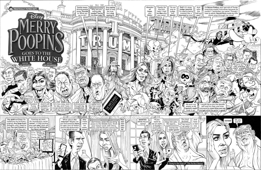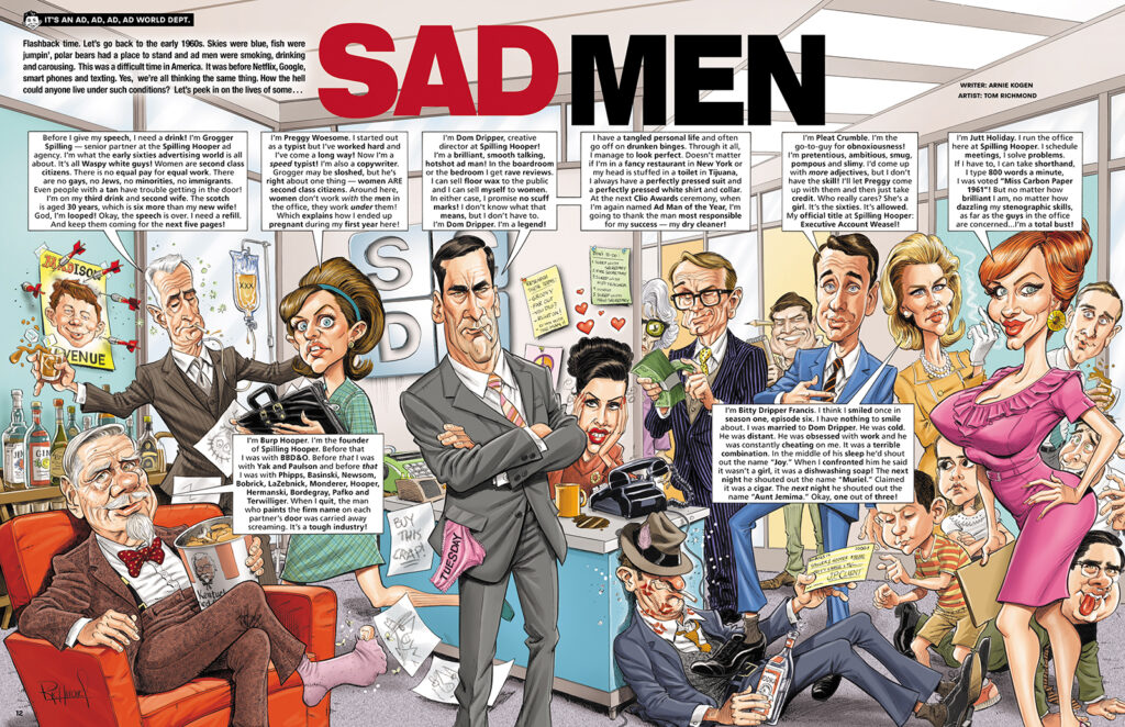 Break out the bourbon and light up your smokes, it’s time for another look back at the work I did for MAD magazine! This week we revisit one of my all time favorite parodies I ever did for the magazine, a spoof of the TV series “Mad Men”, written by Arnie Kogen and first appearing in MAD #508, April 2011. Why is this one of my favorites? First off, I loved the show so it was not a chore watching episodes and getting to know the characters, which helps a lot of both the caricatures and coming up with insider gags. Second, the show was… READ MORE
