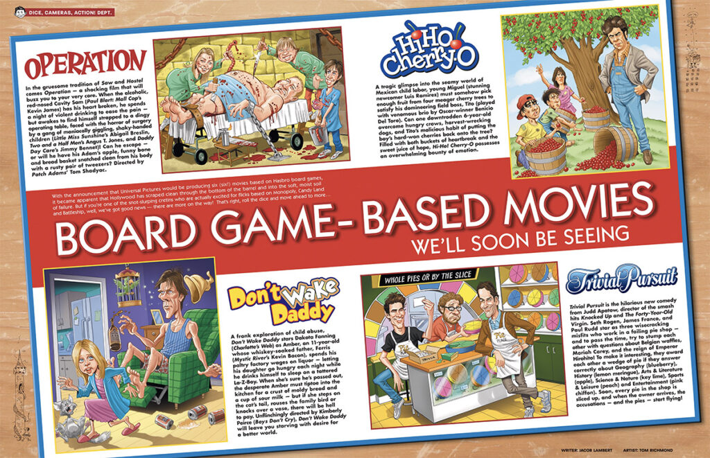 It’s time to roll the dice and move the around the board with this week’s look back at my work for MAD Magazine. Here’s a second piece I did for MAD #502, Jan 2010, written by Jacob Lambert. This two pager was a response to the rash of movies based on board games. This was the first time I used my “colored line” technique on a MAD job. I had just figured out how to do it and had done a couple of freelance illustration jobs using it, but I had never had the occasion to use it for MAD. The technique starts with the… READ MORE