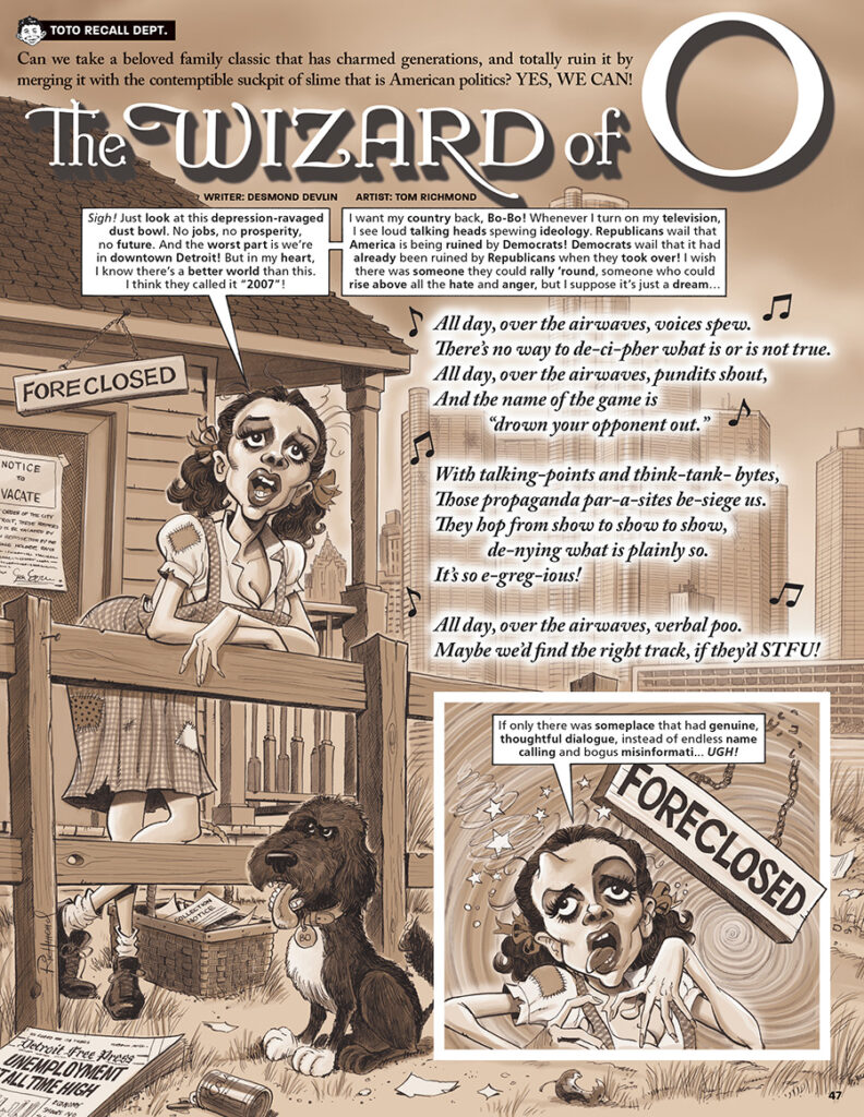 There’s no place like Monday! There’s no place like Monday! It’s time for another trip over the rainbow with another look back at my work for MAD. Today we drop in on one of the most unique pieces I ever did for the magazine. Is it a movie parody? Yes.. sort of. Is it a political piece? Yes, definitely. Does it contain a ridiculous number of caricatures of political reporters, commentators and satirists? That would be a big “you betcha”. We are not in Kansas anymore! Desmond Devlin wrote this six pager called “The Wizard of O” for MAD #505, Oct 2010. This was a… READ MORE