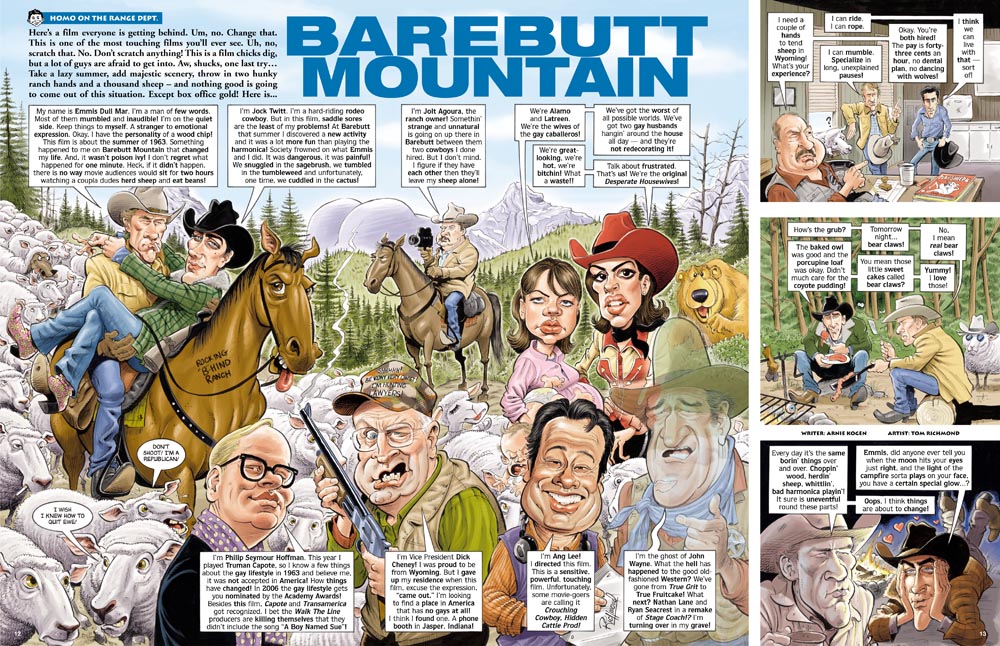 Yeehaw! It’s Monday, and that means it’s time for another stop on the dusty trail that is my work for MAD Magazine. Today we have a look at MAD‘s spoof of the multiple Oscar winning film “Brokeback Mountain”, written by Arnie Kogen and appearing in MAD #465, May 2006. I thought MAD doing a spoof of this film was a real surprise for a couple of reasons. First, because of the lag between when a movie is in theaters and when the MAD parody appears in print, and given how short a time most movies spend playing in theaters nowadays, MAD mostly stuck with big… READ MORE