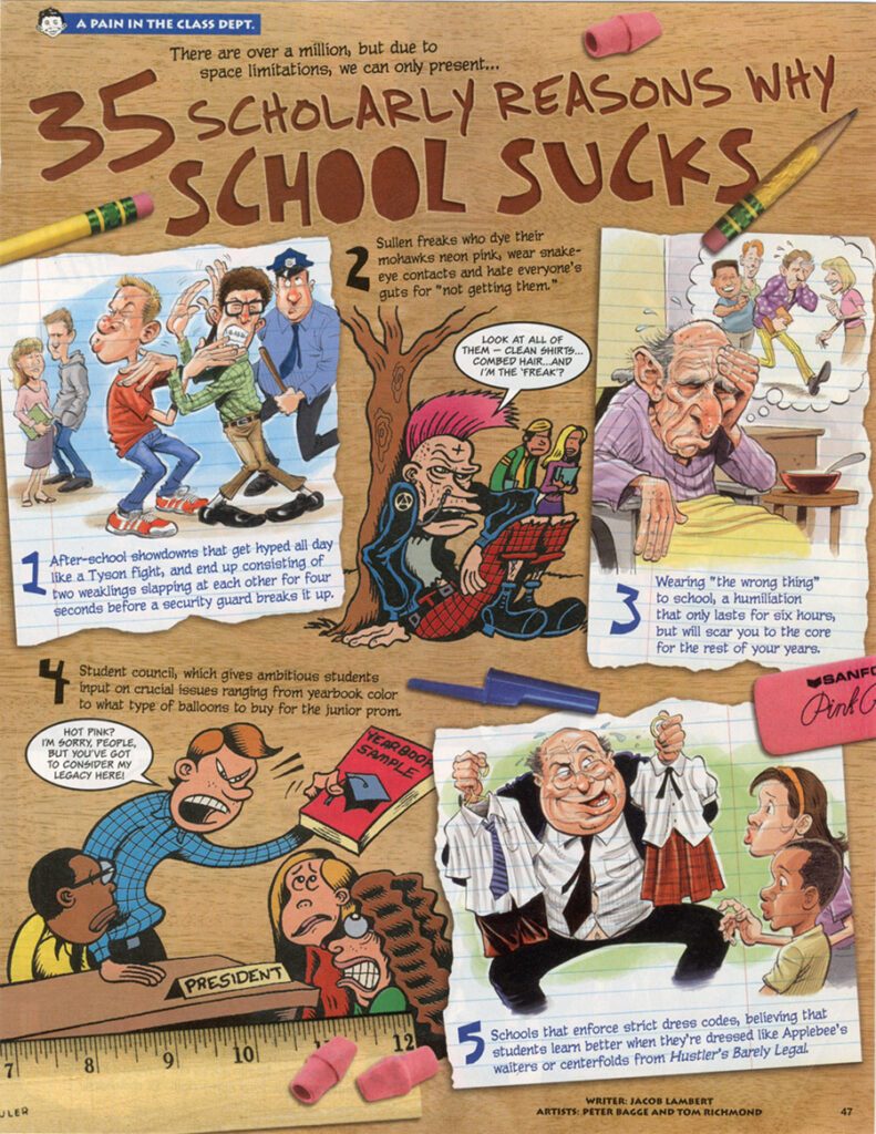 Attention, class! Stop with the spitballs and paper airplanes, ya momsers! It’s Monday and time for another history lesson on the worst of MAD Magazine with a look at “35 Scholarly Reasons Why School Sucks!”, written by Jacob Lambert and drawn by me and the terrific Peter Bagge! I thought it was a cool concept with this feature to split the art duties between myself and Peter. He had just started having art in MAD about a year earlier, but was already very well known for his comic book Hate and other work. I did not see any of Peter’s art on this until I… READ MORE