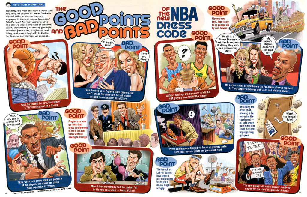 It’s Monday! That means it’s time to hit the hardwood and drive to the paint with another sports-centric job for MAD. This is one of those two page spreads made up of individual spot illustrations and an unwieldy, far too long and wordy title we all love to page right past as we look for Sergio‘s “A MAD Look At…” This one is called “The Good Points and Bad Points of the New NBA Dress Code”, written by Jeff Kruse and Nate Fakes and first appearing in MAD #462, Feb 2006. Not much to say about this piece other than it would prove to be… READ MORE