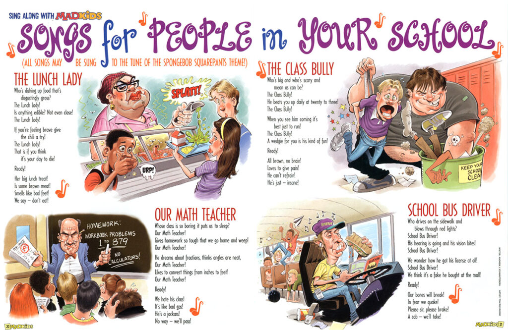 Pay attention, class! We are taking a quick recess from our chronological review of my work in MAD magazine to have a lesson on some stuff I did for its all-too-brief sister publication, MAD KIDS. In late 2005, MAD started publishing a second magazine aimed at the grade school “Nickelodeon” market called MAD KIDS. It featured some reprinted content from the MAD archives that was often softed up for younger readers, but also had a lot of new content as well as puzzles and games. There were younger, kid versions of Alfred and Spy vs. Spy, and in general the humor was aimed at the… READ MORE
