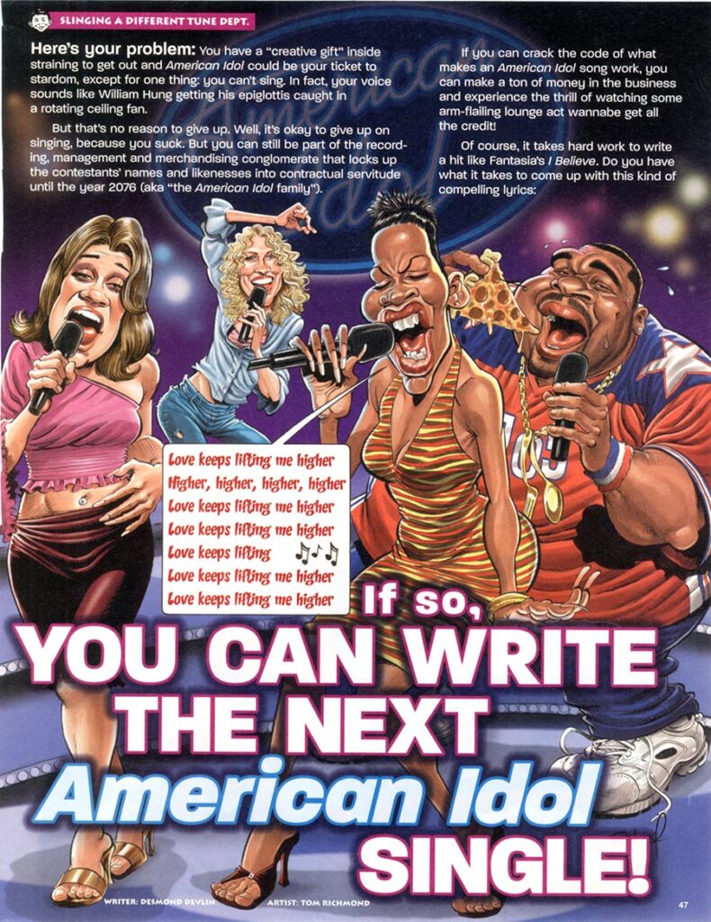 It’s time for another off-key Monday edition of Tom’s MADness! This time we drop the mic with a return to the world of “reality” TV and another cringe-worthy performance with “You Can Write the Next American Idol Single”, written by my CLAPTRAP partner Desmond Devlin and appearing in MAD #466, June 2006. This was also my 50th appearance in the magazine. I have to admit I don’t like these kinds of reality competition shows, and have never watched more than a few episodes of any of them. It’s not that I think they are bad shows, I just find them uninteresting and boring. My wife… READ MORE