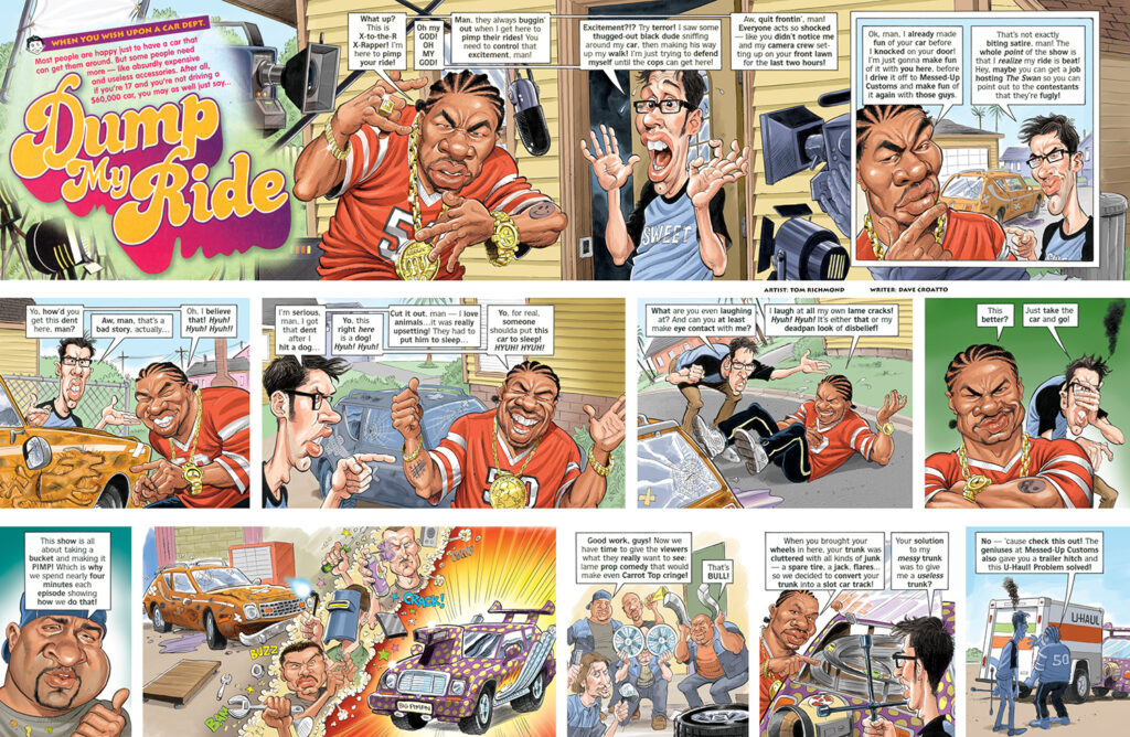 It’s time for another pitstop on the pot-hole riddled road that is my work for MAD Magazine. This spoof of MTV’s “Pimp My Ride” was my 13th TV show parody for MAD. It was also my second collaboration with MAD editor Dave Croatto as writer… and my last with Dave. I guess he thought enough was enough. This feature appeared in MAD #456, Aug 2005. This is unusual but I have scans of the final pencils of this job as opposed to the “roughs” I usually save. Ordinarily I would do rough sketches of the pages on drawing paper or later digital done at print… READ MORE