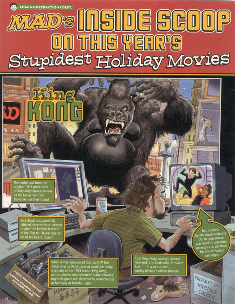 Looks like it’s Monday AGAIN, so time for another naustiating look back at my work for MAD Magazine! This week’s episode is a holly, jolly look at the holiday follies that were the December movies of 2005. “MAD’s Inside Scoop on This Year’s Stupidest Holiday Movies” was written by Desmond Devlin and Scott Maiko, and first appeared in MAD #459, Nov 2005. The opening page with the “King Kong” movie gags was just reprinted in MAD #20 a few months ago. I recently read that “King Kong” star Adrian Brody turned down a role he was offered in “The Lord of the Rings” which he… READ MORE