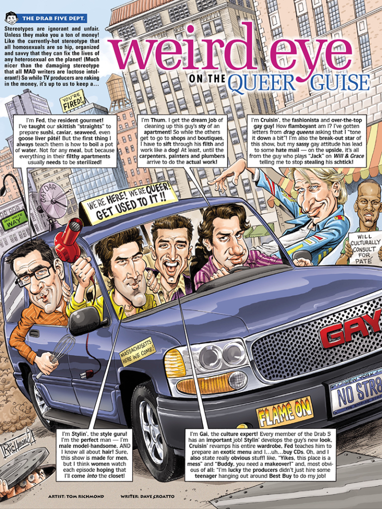 It’s yet another electrifying episode of the chronologial crawl through my work at MAD magazine. This week is a look at the parody of the TV show “Queer Eye for the Straight Guy” (with the original cast) from MAD #443, July 2004. This feature was my the first collaboration between me and former MAD editor Dave Croatto. I would go on to illustrate on other MAD parody written by Dave just a few issues later, but years later he and I would team up to do two MAD children’s book parody books, Goodnight Batcave and Superman and the Miserable, Rotten, No Fun, Really Bad Day. Once again when doing one… READ MORE