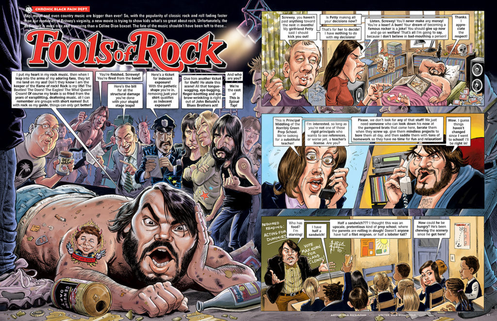 It’s yet another stop on our long and winding road of jobs I did for MAD Magazine. Today is a look at MAD’s spoof of the movie “School of Rock”, written by Dick DeBartolo and appearing in MAD #438, Feb 2004. I am sometimes asked if doing parodies of comedies is a bit trickier than doing them of dramas or “serious” movies. It is but really only from the writing sense. Making fun of a plot that is in and of itself a satire or meant to be silly is a tougher nut to crack for the writer. Dick did a great job on this… READ MORE