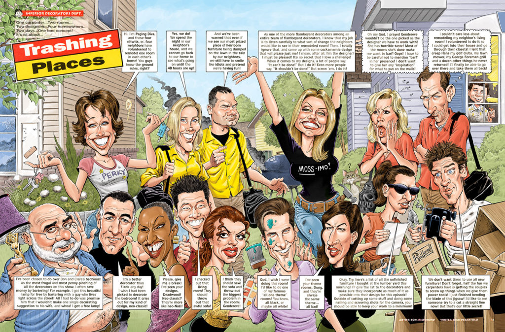 I’m sure you are on the edge of your seat for yet another fascinating episode from our weekly chronological crawl through my work for MAD Magazine. This week’s episode features a spoof of the TLC home improvement show “Trading Spaces”, written by MAD‘s Maddest writer Dick Debartolo, and appearing in MAD #435, November 2003. This was the first of what would be four home improvement/HGTV “reality” show parodies I would draw for MAD, and I believe they did a couple of others drawn by other artists. This always made me scratch my head a bit. There were many really popular TV series that MAD never… READ MORE