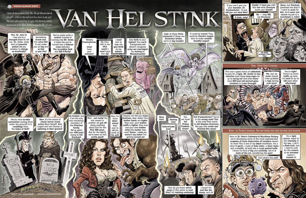 I know you have all been waiting with breathless abandon for us to resume our look back through my work for MAD Magazine! This week’s episode features the very FIRST parody where I used a Wacom Cintiq for the digital coloring. It was a spoof of the movie “Van Helsing” written by Dick DeBartolo and first appearing in MAD #445, Sept 2004. I have the pencil roughs for this one! I remember this assignment, particularly the splash page, because it was set up differently than a typical splash. There was a column of panels on the right that delved into the actual parody, leaving only… READ MORE