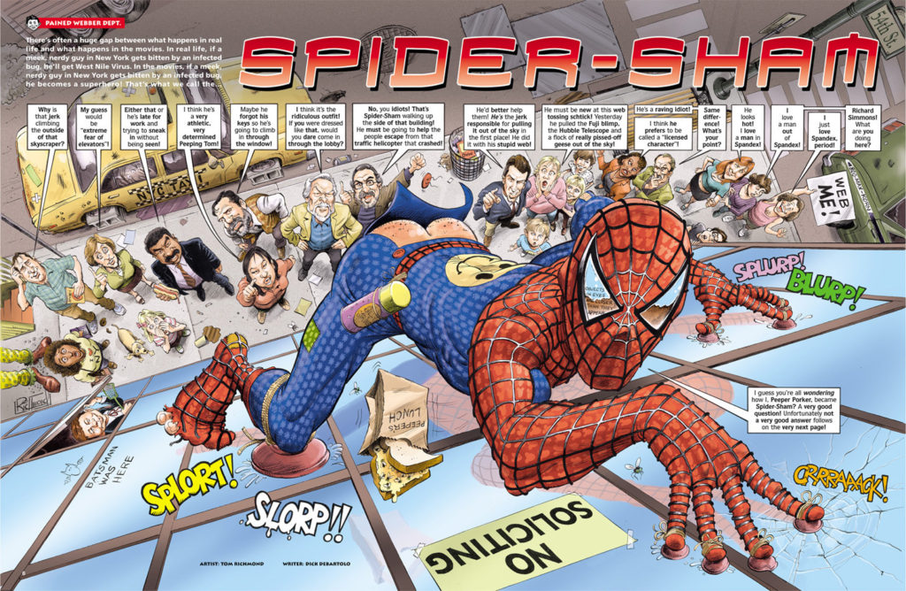 We continue our Monday MADness chronological crawl through my work for MAD with a look at my 15th appearance in the magazine, and my first “Superhero” movie parody. This is a spoof of the first Tobey Maguire Spider-Man film, written by Dick DeBartolo and appearing in MAD #418, June 2002. I remember I inked a lot of this job while I was attending a National Caricaturists Network convention in Las Vegas in 2002. That splash page features a lot of cameos of people I know. From the far left, the guy in the blue shirt is my pal Jim Batts, the little girl with the… READ MORE