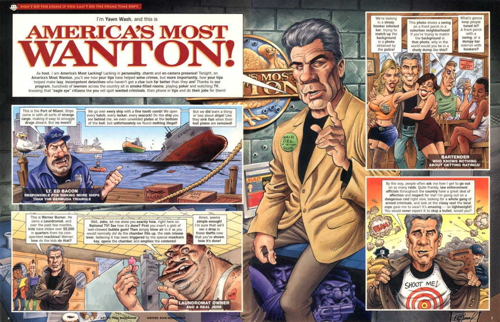My next assignment (number 11) for MAD was the art for a parody of the TV show “America’s Most Wanted”, a sort of reality show that featured re-enactments of crimes by known fugitives (played by actors on the show) and interviews with actual law enforcement involved in the investigations, all with narration by the show host John Walsh. There was a hotline number to call if you have seen or have any information helping to capture the fugitive being featured. The show claimed to have led to the capture of over 1000 fugitives in the 25 years it ran on Fox. This spoof was written… READ MORE