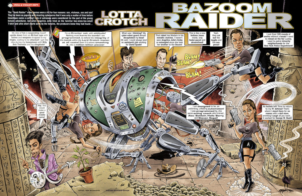 We continue our Monday MADness chronological crawl through my work for MAD with a look at my eighth appearance in the magazine, a parody of the 2001 film “Lara Croft: Tomb Raider” subtly titled “Lotta Crotch: Bazoom Raider”, written by Desmond Devlin and appearing in MAD #410, Oct 2001. This movie was of course based on the popular video game, and starred a young Angelina Jolie in the title role. Her casting was criticized by video game fanboys mainly because they didn’t think she had big enough breasts to play the famously chesty Lara Croft. That is, of course, ridiculous considering this was a fictional… READ MORE