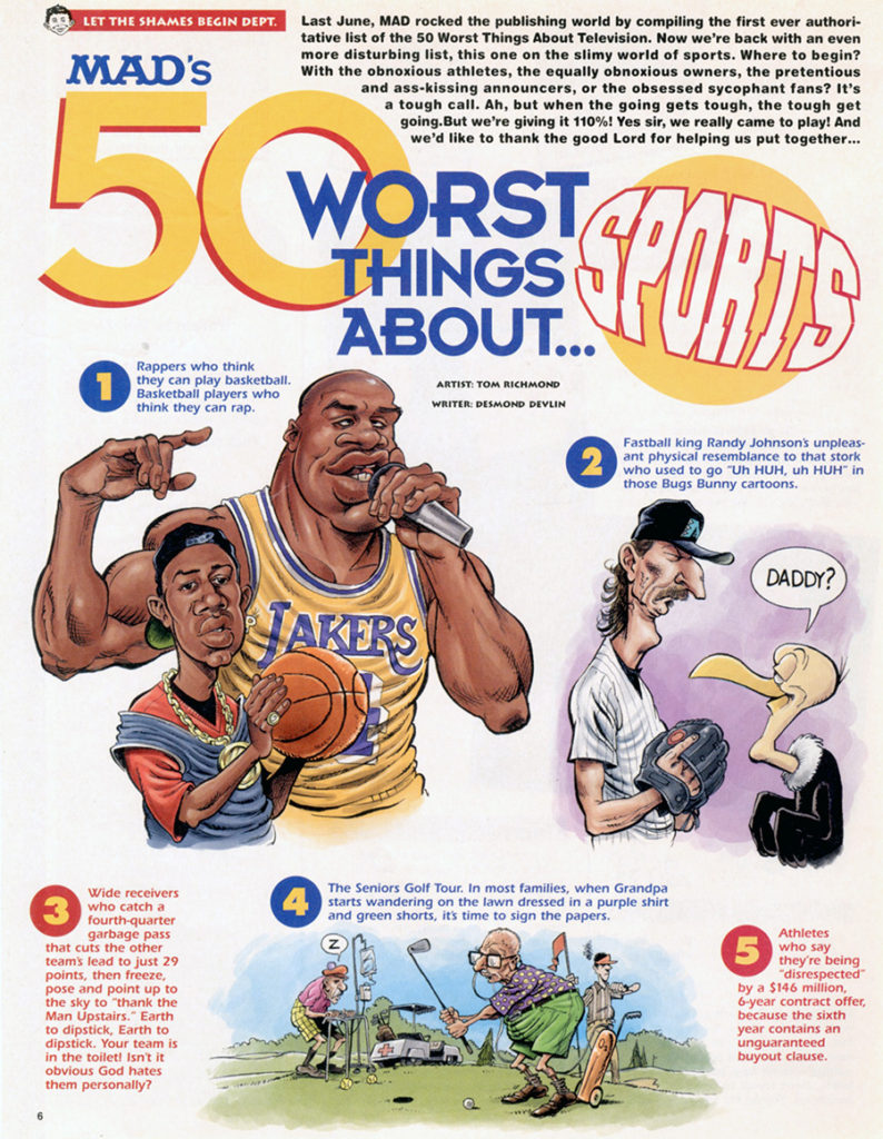 Each Monday I’m doing an installment of a complete, chronological look at every job I did for MAD over my 20 year run for the magazine, complete with whatever stories, anecdotes, or milestones, might apply along with the full article. My next job for MAD was a seven pager called “MAD‘s 50 Worst Things About Sports” written by my CLAPTRAP cohort Desmond Devlin for MAD #408, Aug 2001. This piece was my longest so far for the magazine, and the second that was considered the “lead” feature… meaning the cover was a tease for this particular article. Of course I did not know that at… READ MORE