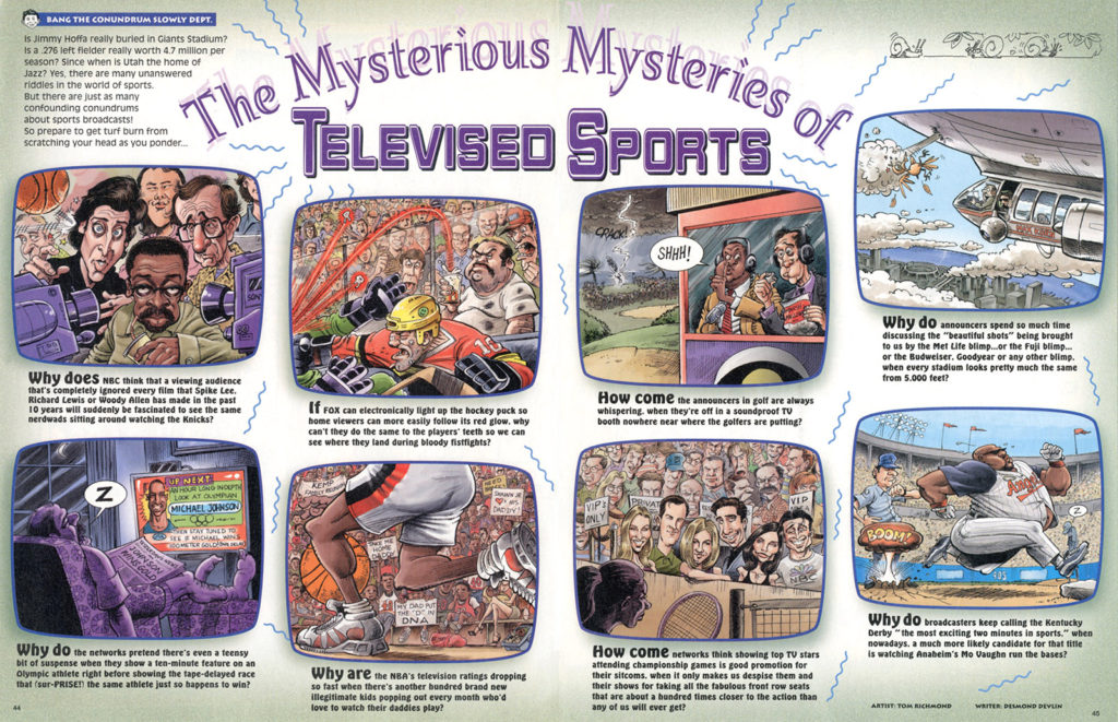 We continue our Monday MADness chronological crawl through my work for MAD with a look at my ninth piece for the magazine, a two page article called “The Mysterious Mysteries of Televised Sports”, written by my CLAPTRAP cohort Desmond Devlin for MAD #412, Dec 2001. If you have been following along on Mondays, you may be noticing a trend here. Of the nine features I had so far illustrated for MAD, seven of them were written by Des. Some say it’s because no one else wanted to work on his lame scripts, but I suspect it’s because the guy was so prolific there was just a lot of… READ MORE