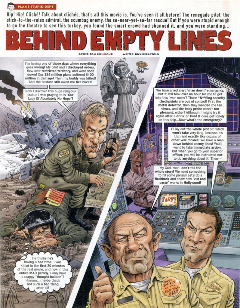 MAD #415 contained my 12th job for the magazine, a spoof of the film “Behind Enemy Lines” starring Gene Hackman and Owen Wilson, written by Dick DeBartolo. The issue was dated March 2002, but the art was done in December of 2001. This was the first movie parody I drew that was written by Dick, and the script was both funny and pretty vicious! The only thing I remember about working on this one was having a really tough time drawing Gene Hackman, and looking back at it now I still don’t like many of the caricatures of him I did. Actually this is one… READ MORE