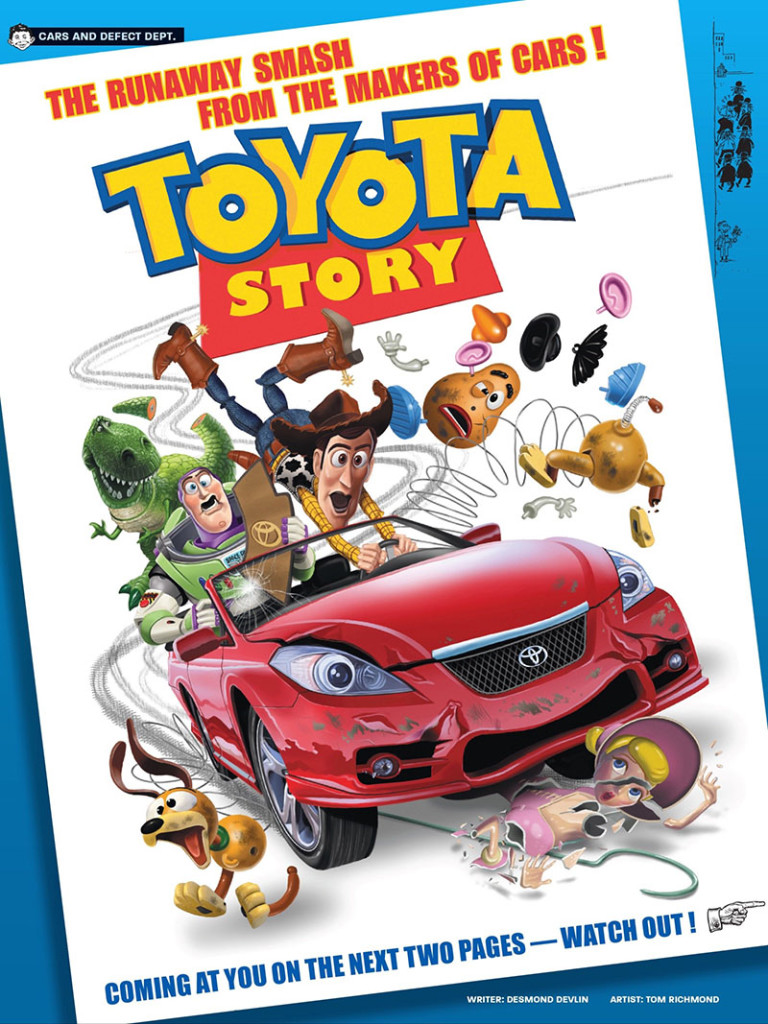 Today’s Monday MADness is a look back at a three pager Desmond Devlin and I did for MAD #504, August 2010. Back then Toyota was in some hot water for an “unexplained acceleration” issue with their card that resulted in a lawsuit and investigation. This was a play on that with the Toy Story gang. Originally I just did a movie poster spoof that was a little different than the above for the MAD website, but then they expanded it into a short story for the actual magazine. Trying to get the look of the Pixar characters was time consuming. I went straight from pencils… READ MORE