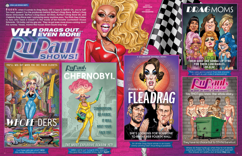 MAD has started with the sneak peeks of issue #12 on their Instragram, and they started with this close up crop of a feature I did the art for. Yes, MAD is going to have some new content in each ongoing issue and, yes, I did the art for a two pager for issue #12. As they reveal on their post, the article is called “VH1 Drags Out… Even More RuPaul Shows!” written by Grant Reed. READ MORE