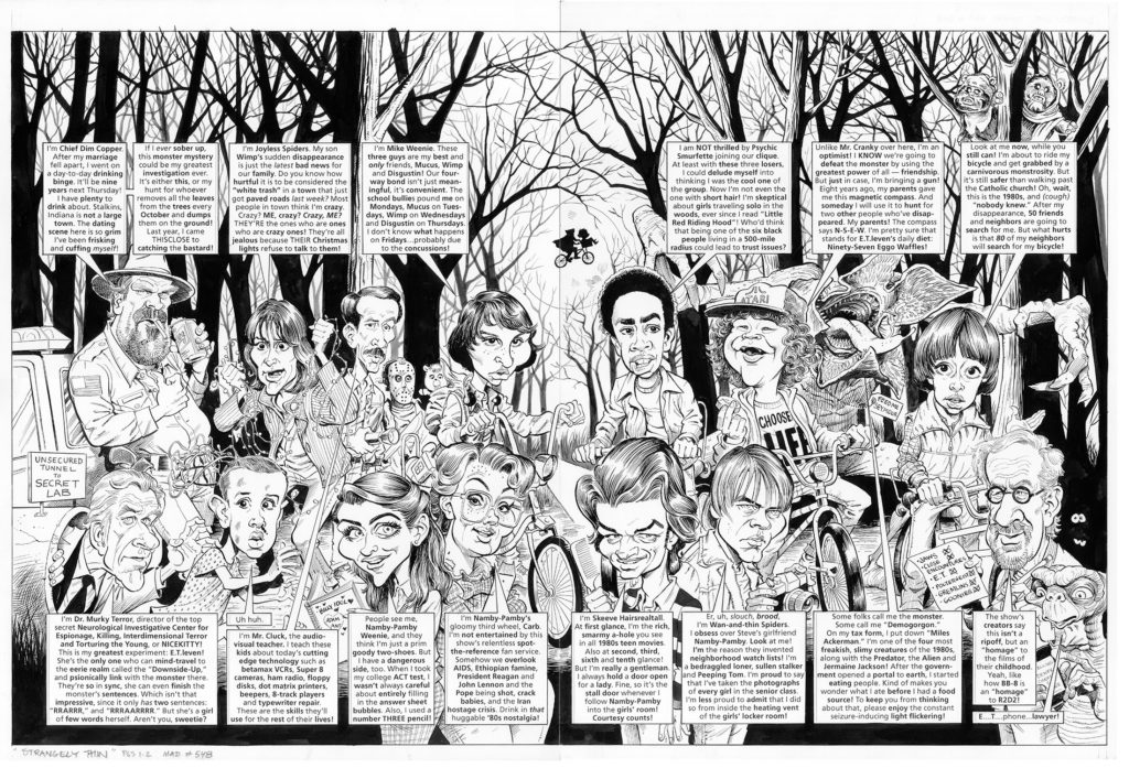 It’s very rare that I offer to sell the original art from an entire parody, but due to some sudden household repair expenses I’m making this piece available. It’s the entire 7 page parody of the hit Netflix show “Stranger Things” from MAD #548. Two page splash above, story pages below. If you happened to visit the exhibit “Artistically MAD” at the Billy Ireland Cartoon Library and Museum last year you saw this entire parody on display. The pages are inked with dip pen/brush on heavy bristol board. The text has been reproduced exactly as in print and pasted up using archival materials. The page… READ MORE