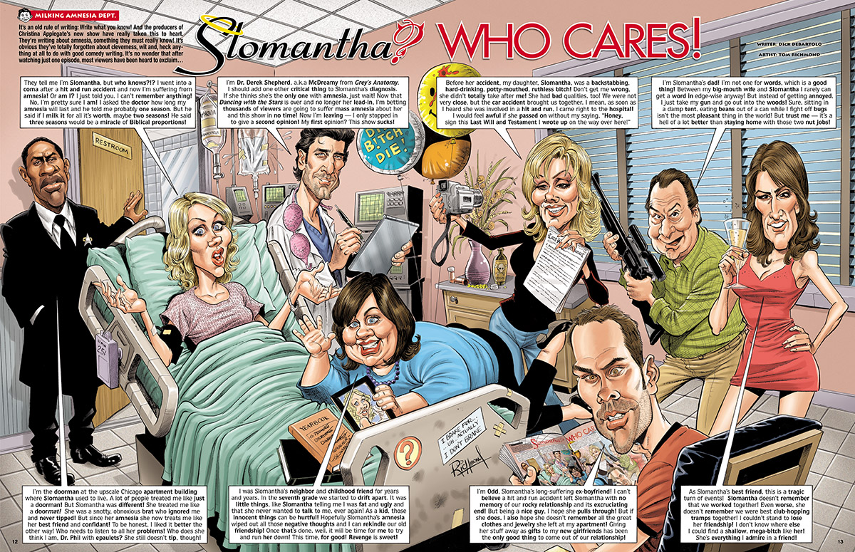 Here’s a rare look at a splash page I did for a MAD parody from roughs through final pencils, inks, and color. The published final is above. It’s rare because I very seldom scan my final pencils in before inking them, so I have few examples of the pencil stage. This is a parody of the short lived TV show “Samantha Who?” as written by Dick DeBartolo and appeared in MAD #489, May 2008. Clicky to embiggen. Pencil Roughs Final Pencils Inks Final Color READ MORE