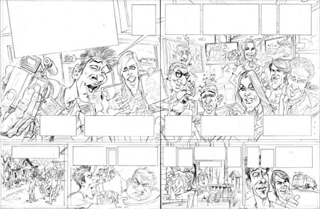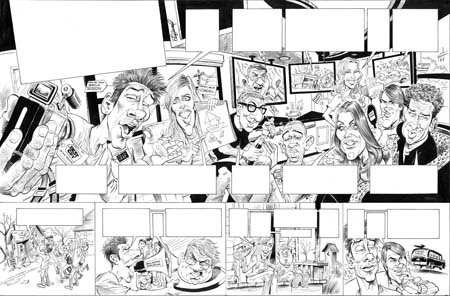 Once the pencil roughs are approved with the gang at MAD, I can move on to the final pencils. This is the stage where most of the hard work occurs. The first thing I do is transfer the roughs on to the final boards. I do this by blowing up my scans of the roughs to 200% of original size, and then printing them off on 11???17 paper. In the case of a splash, I have to use the 13???19 paper and print the image in quarters, then trim and tape them together. With the story pages, a typical row of panels fits an 11???17… READ MORE