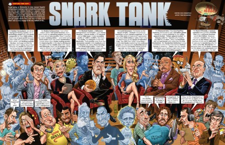As promised, here’s a sneak peek at my art from the Dick DeBartolo scribed parody of “Shark Tank” in the latest issue of MAD (clicky any to embiggen…): If you are familiar with the show, it’s a reality series where hopeful entrepreneurs pitch product ideas to a panel of rich business people, who then either reject them or bid on investing in a portion of their concept. Most of the time the entrepreneurs are inventors of some process or idea, thus the scene with lots of inventors both dead and alive (mostly dead). Dick also wanted to use a couple of people he works with… READ MORE
