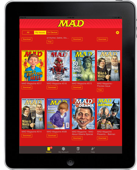 April 1st is officially Alfred E, Neuman’s birthday, so what better day to issue an update to the MAD iPad app? The app sports an all new design… for those using iOs 7 or higher, anyway. I had a chance to play around with it today and I like the new layout and especially the organization of the “Issues” menu page. You now have three different sections: All– This was previously all you had in the old design under “Issues”. It lists every issue, book or special available for download or purchase. The ones you have bought or are available to you via your subscription… READ MORE