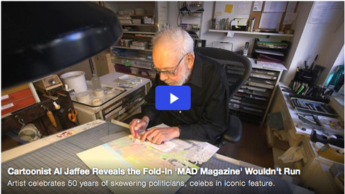 I know it looks like that should be an embedded video but sadly that’s not possible, so clicking on it will bring you to a Yahoo News story (with a short video!) about how Al Jaffee‘s “MAD Fold-In” turns 50 next month. The story starts out: It just might be one of the longest freelance gigs in magazine publishing history. Cartoonist Al Jaffee has contributed to MAD Magazine, the satirical mainstay, since its beginnings, and is marking the 50th anniversary of not only creating but illustrating its most iconic feature. I’m not sure it’s fair to call the fold-in MAD‘s “most iconic feature”…many might say… READ MORE