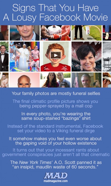 ¬¨‚ĆClicky to visit the MAD website If you don’t regularly visit the MAD Magazine website you are missing out on some timely and funny stuff. Since they relaunched it a couple of years ago (originally called “The Idioitcal”, a title I loved but which they seem to have dropped) they have been terrific at posting daily pieces that give the MAD treatment to in-the-moment subjects, something the production time of a print magazine makes impossible. The one above is a perfect example. Just hours after the “Facebook Video” thing started happening the guys at MAD jumped on it with this, posted yesterday. New Jersey Governor… READ MORE