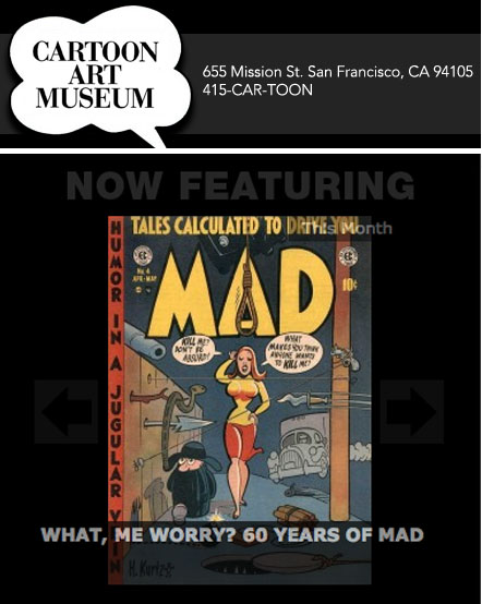 The show “What, Me Worry? 60 Years of MAD” opened this past weekend at the Cartoon Art Museum in San Fransisco, CA. Here’s one of many pictures you’ll find on the CAM Facebook page: Clicky to Embiggen… Shown above: MAD #1 cover reproduction, hand-colored by Marie Severin; Hex! splash page by Jack Davis from MAD #2; Melvin! splash page by John Severin, from MAD #2; cover to MAD #3 by Harvey Kurtzman; splash from Dragged Net! by Will Elder from MAD #3; cover to MAD #4 by Harvey Kurtzman; splash page from Shadow! by Will Elder, from MAD #4; house ad by Wally Wood from… READ MORE