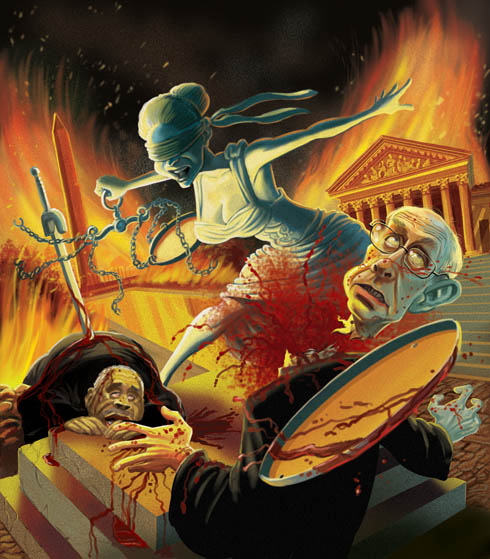 As promised, here is a sneak peek at some of the images I did for the “Punitive Damages: A Game of Extreme Justice” feature in MAD #512. The video game “cover” The premise of the article was an mock ad for a video game featuring the U.S. Supreme Court Justices, satirizing their decision to allow ultra-violence in video games being targeted at kids as a first-amendment protected right. In the game, the Justices are trying to get past various opponents and obstacles like: Crazed protesters Monster laws and amendments (yes… nod to Schoolhouse Rock!) Fat, former politicians Zombie Founding Fathers Finally, the winner get’s new… READ MORE