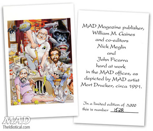 This from the editors of MAD via the official MAD Blog, The Idiotical: The postcard you see below depicts MAD founder/publisher William M. Gaines, longtime editor Nick Meglin, and current (and also longtime!) editor John Ficarra “hard at work” in the old MAD office at 485 MADison Avenue. It was illustrated by the one and only Mort Drucker! (Yep, the very same Mort Drucker who used to draw covers for the Bob Hope comic book.) We came across a big stack of them in the stock room, but as you can see, there was a limited number produced: So, Do you want one of your… READ MORE
